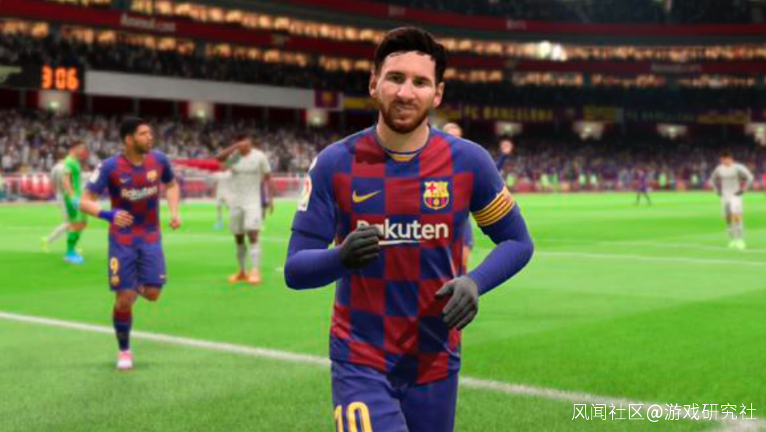 我們之所以能一眼認出下面的梅西是個假貨,是因為即便在多邊形瘋狂堆料的前提下,次表面散射技術的缺乏,使得虛擬球員的皮膚依然過分嬌嫩細膩,球衣材質更是充斥着各種不自然的反光,很難擺脱那股熟悉的塑料感。
