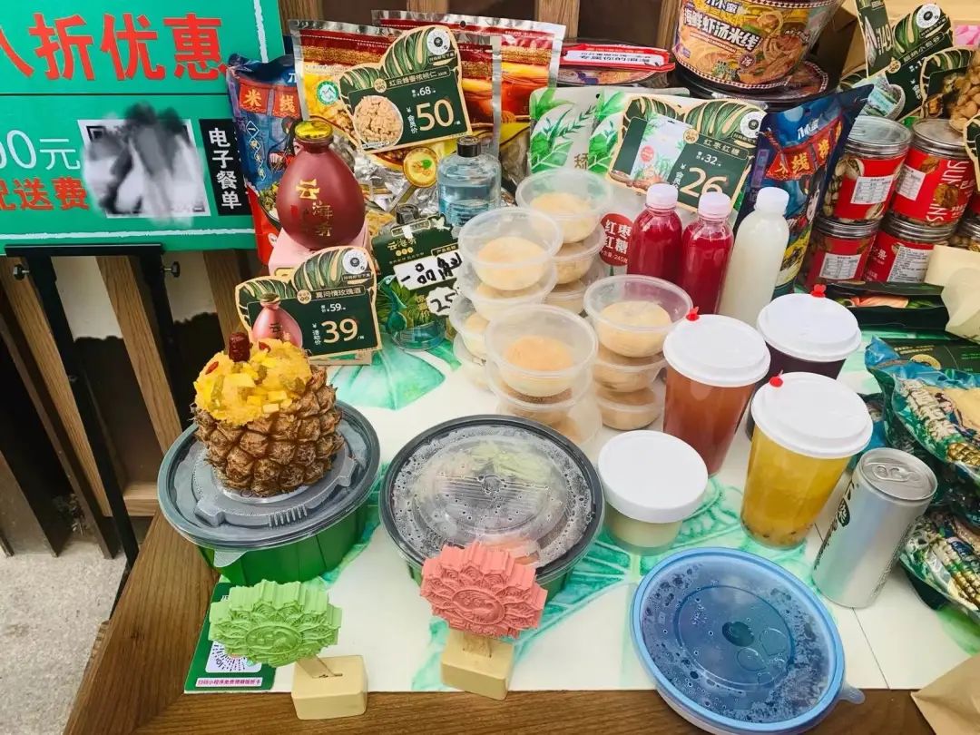 沿街的餐飲店紛紛在自家店門口支起了小攤或小推車,或售賣盒裝的小菜、熟食,或售賣自熱鍋、堅果零食、粽子和茶葉禮盒,或售賣店內製作的果茶、飲料。擺攤售賣原材料的店家也不在少數,例如海底撈就變成了“蔬菜水果”小販,原本用來做果盤的菠蘿、蜜瓜、西瓜、葡萄等水果,被做成了果切售賣。