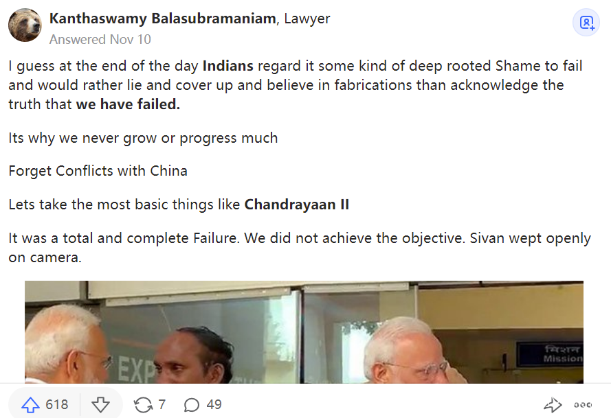 在外網有一個話題:**為什麼印度人不能接受他們在與中國衝突期間的失敗?**一些印度網民發表了自己的意見,其中 Kanthaswamy Balasubramaniam 的見解最有新意。