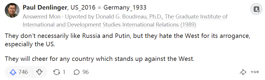 他們不一定喜歡俄羅斯和普京,但他們討厭西方的傲慢,尤其是美國。