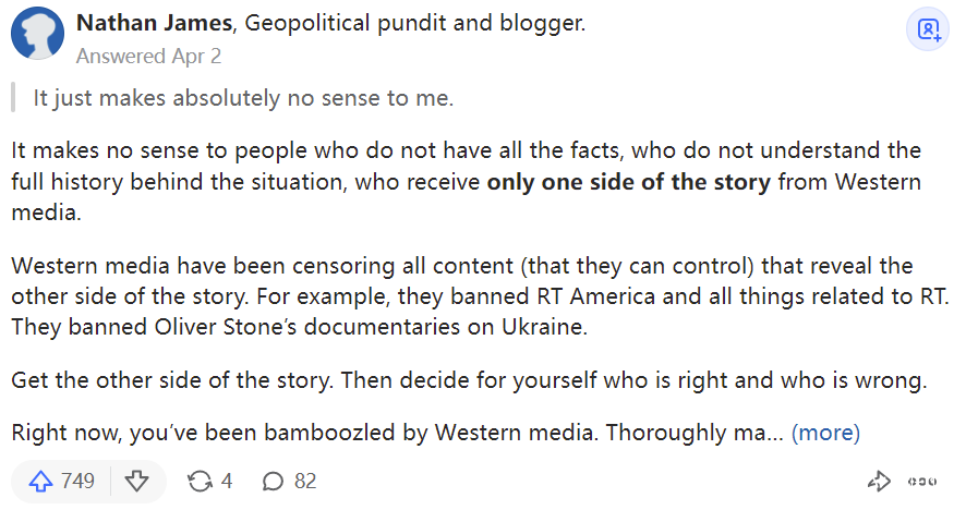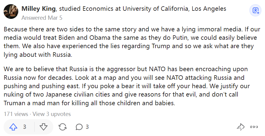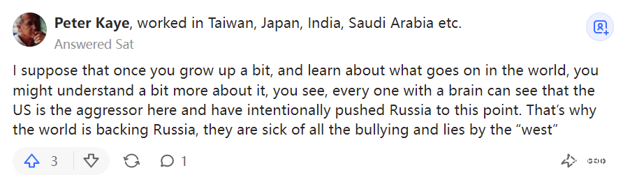 在外網有一個話題:**為什麼全世界有這麼多人真正支持俄羅斯和普京?這對我來説完全沒有意義。**很多國外網民發表了自己的意見。