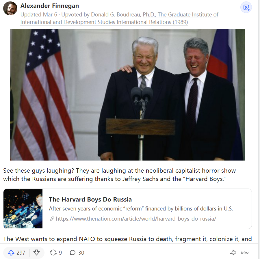 看到這些人在笑嗎?他們在嘲笑新自由主義資本主義的恐怖表演,由於傑弗裏-薩克斯和"哈佛男孩"的存在,俄羅斯人正在遭受這場表演。