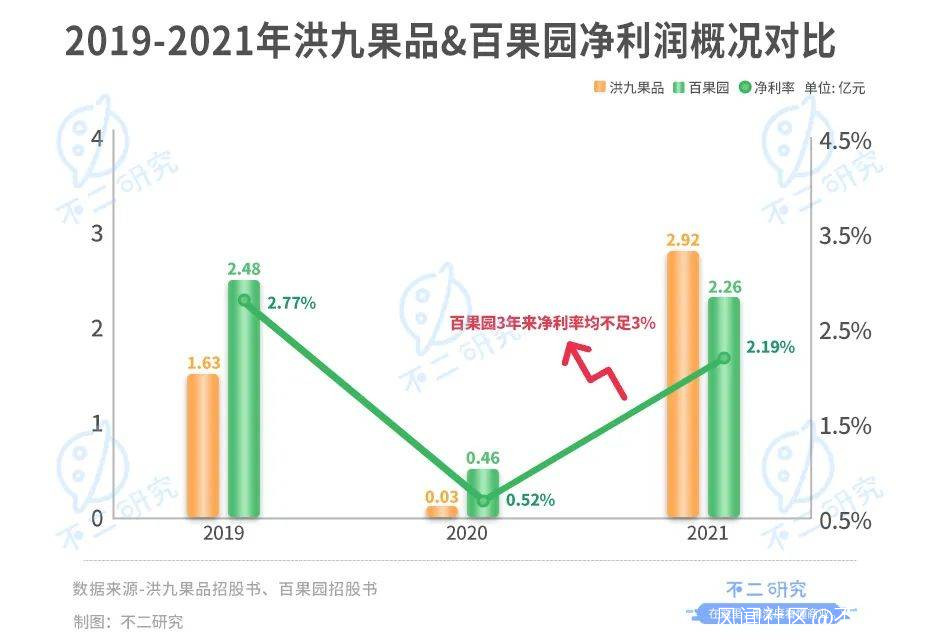 除了洪九果品財務出現問題外,百果園的財務問題也逐漸顯露。最大的問題在於百果園的盈利能力,據其招股書顯示,2019-2021年百果園淨利潤為2.48億元,0.46億元,2.26億元,對應淨利率為2.77%,0.52%,2.19%。百果園3年來淨利率均不足3%,盈利能力困境明顯。