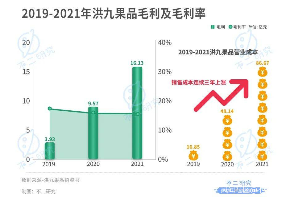 據洪九果品招股書顯示,洪九果品的銷售成本連續三年上漲,2019-2021年其營業成本分別為16.85億元,48.14億元,86.67億元。同期對應毛利為3.93億元,9.57億元,16.13億元,毛利率為18.91%,16.58%,15.69%,毛利率三年連降。