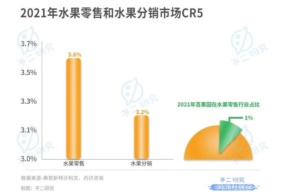 儘管7.6%的年複合增長率對於資本而言並沒有太大的想象力。但據弗若斯特沙利文數據顯示,2021年水果銷售行業CR5僅3.6%,其中百果園佔1%;同時,據灼識諮詢數據顯示,2021年水果分銷行業CR5為3.2%。
