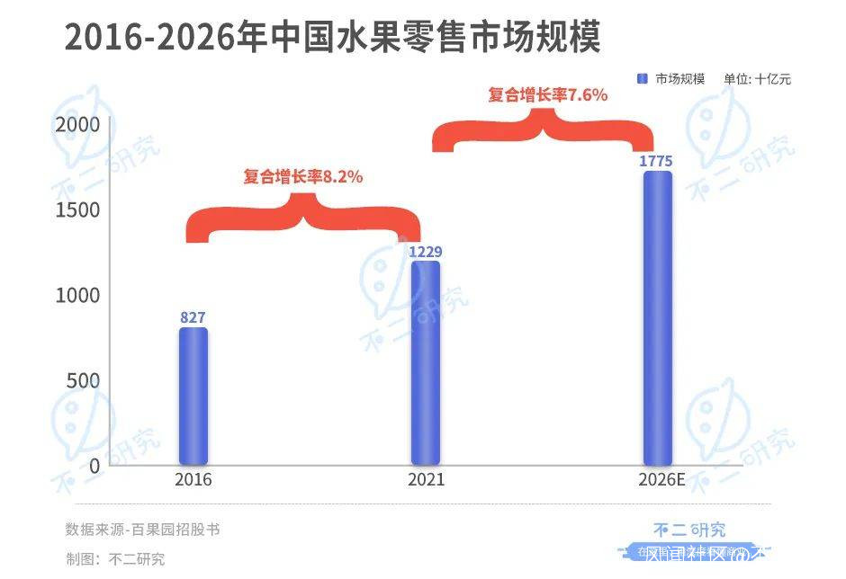 據弗若斯特沙利文數據統計,中國的水果銷售市場已由2016年的8273億元增至2021年的12290億元,年複合增長率為8.2%,預計2026年按零售額記,水果市場的市場規模將達17752億元,年複合增長率為7.6%。