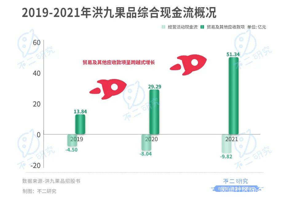 同時,洪九果品的現金流和應收賬款也不盡人意。據其招股書顯示,2019-2021年洪九果品經營活動產生的現金流淨額分別為-4.50億元,-8.04億元,-9.82億元,洪九果品稱,經營活動現金流出主要由於貿易及其他應收款項大幅增加,為優質水果產品做出預付款項。而貿易及其他應收款項呈跨越式增長,2019-2021年分別為13.84億元,29.29億元,51.34億元,應收款項佔其營收近一半的比例。