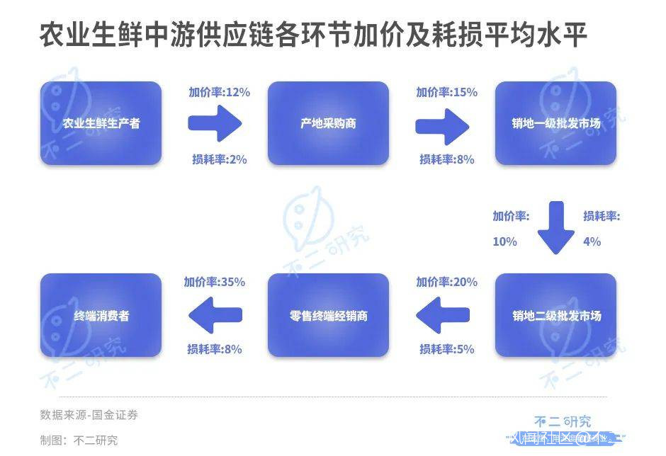 據國金證券研報顯示,從產品屬性角度看,水果為非標準產品,種植端和零售端均較為分散,從果園到零售商可分為採摘、分選、包裝、保鮮、儲存、運輸等多道程序,且大部分分銷商僅能覆蓋一部分程序。因此形成了冗長、高度分散且涉及眾多中間商的行業痛點,漫長的分銷過程不可避免地導致了高損耗率和受限的運輸半徑。