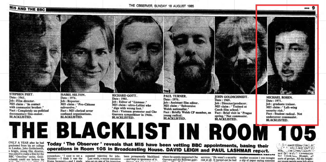 後來羅森才知道被解僱的真實原因。在當時,所有的BBC員工都需要經過英國軍情五處的審查,而BBC大樓的105房間是軍情五處的工作地點。