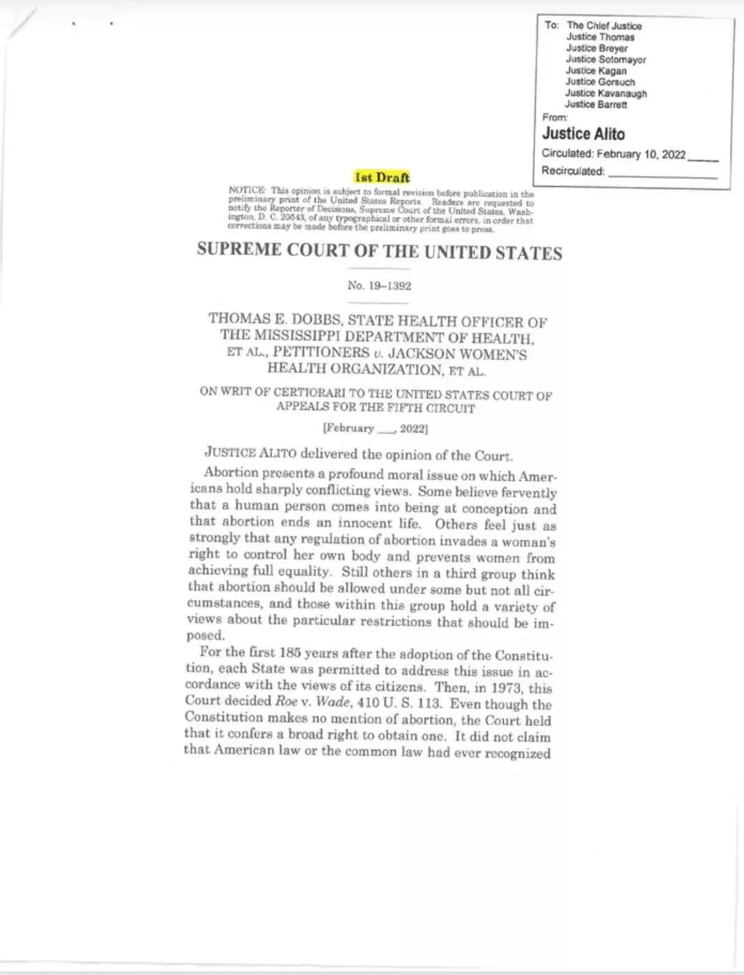 負責起草多數意見書的阿里託大法官在98頁的初稿中寫道:“羅伊案必須被推翻”,“羅伊案濫用了司法權力,從一開始就錯得離譜”。激烈的措辭與立場,在美國最高院中史無前例。