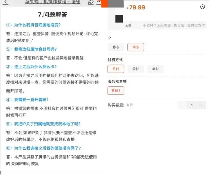 鋅刻度點開手機端免費測試後發現其發來的教程中正是修改IP的方式,且在“問題解答”的板塊裏明確提到關於抖音歸屬地更改的問題,比如“為什麼抖音歸屬地沒變?”的回答中明確提到,“連接之後-重登抖音-隨便找個視頻評論-評論完成後IP就更新了”。