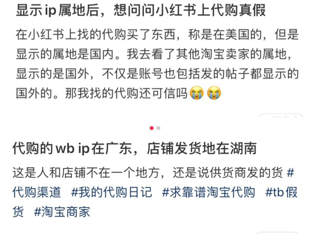 鋅刻度發現,在小紅書和微博上,不少代購在IP屬地公開後都面臨質疑。比如,“代購的微博IP在廣東,店鋪發貨地在湖南。”“IP屬地公開最大的收穫是知道了我的韓國代購在山東。”等等。