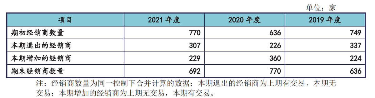 美廬過於注重拓展線下經銷商體系,相當於“一條腿”走路,結果就是風險過高。據招股書顯示,2019年度至2021年度,公司期初經銷商數量分別為749家、636家、770家,各期經銷商退出數量分別為337家、226家、307家,佔期初比例分別為44.99%、35.53%、39.87%。