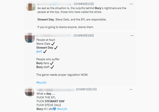 在社交媒體上搜索“伯裏”和先後兩任老闆的名字,充斥着伯裏球迷的指責甚至謾罵。實際上,伯裏在他們手中並不算太差,分別完成一次從英乙到英甲的升級,而斯圖亞特更是曾一度為升級投入了不少資金,最後落得如此名聲,英國球迷是不是太苛刻了?