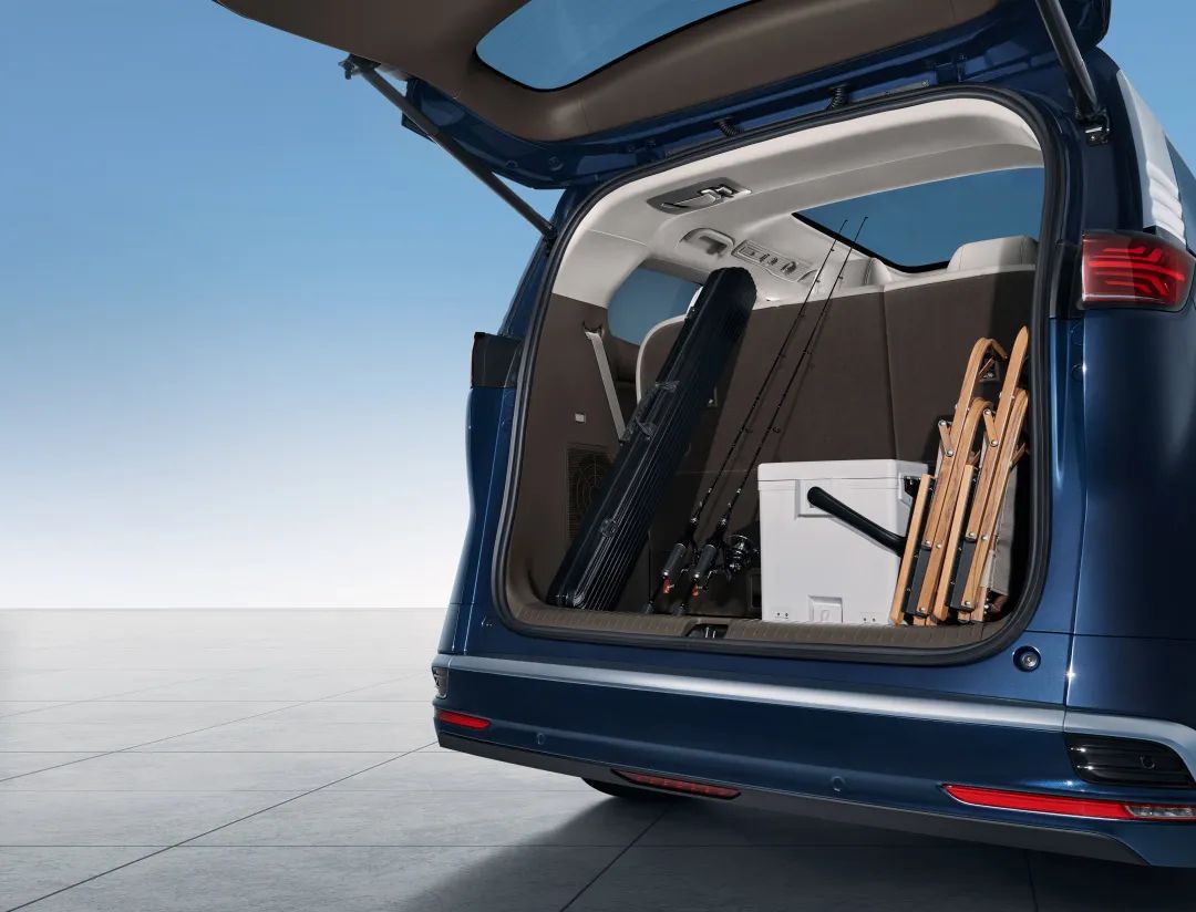 騰勢似乎有更多的想法。趙長江曾表示,「很多都在提汽車是第三空間,騰勢再加一個第四空間」。這裏的第四空間,指的是後備箱,D9 有很多的玩法。如果是家庭出遊的話,後備箱可以裝下不用摺疊的嬰兒車和露營裝備;如果你是一個釣魚愛好者的話,那第三排座椅還可以向前調節,成為一個舒服的釣魚台。