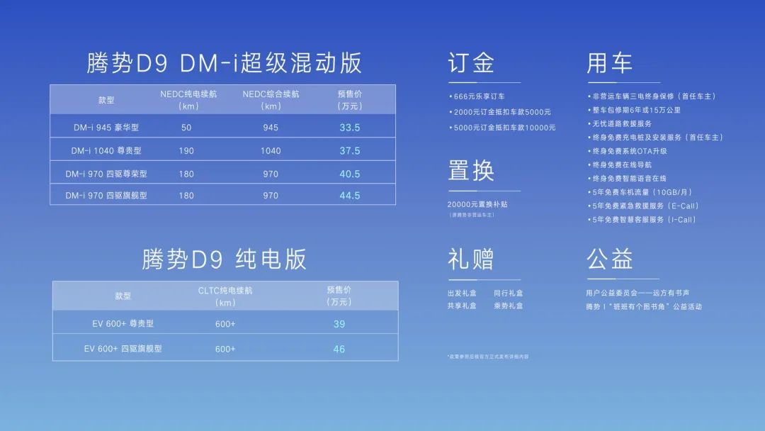 騰勢作為比亞迪集團的高端品牌,可以優先、高品質的獲得當前市場絕對稀缺的領先技術與產能。據瞭解,D9 採用了 DM 和 EV 兩套動力模式。DM-i 超級混動版綜合續航 1040km,遠超傳統主流 MPV 車型。純電續航最大 190km,百公里虧電油耗低至 5.9L;EV 動力系統搭載比亞迪八合一電動力總成、刀片電池等,最長續航超過 600 公里,可以解決用户的里程焦慮。