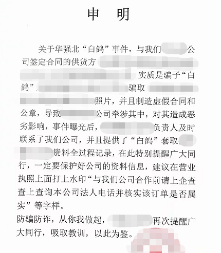 隨後被騙的客户也對此發表了申明,稱該騙子套取了供應商的資料,並且偽造了虛假合同和公章:
