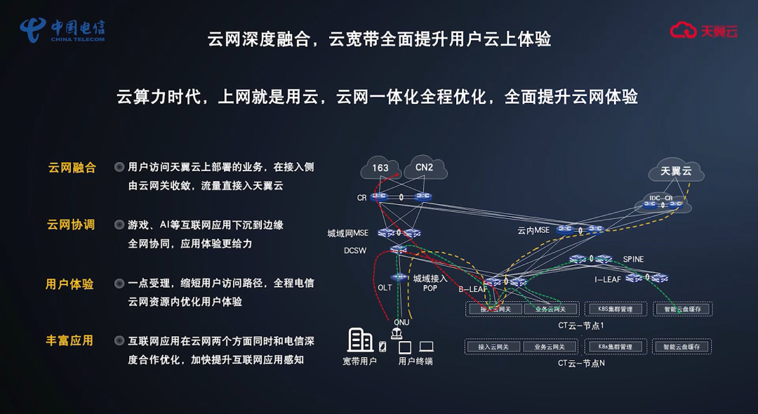某種程度上,雲寬帶重新定義了寬帶,通過雲,它改變了傳統上網場景中,用户只能被動接受電信運營商提供的帶寬網速,而是利用千兆光寬高帶寬、低時延、多切片的優勢,進一步將城域網絡扁平化,減少了用户訪問網絡的轉接跳數,使將一張大網像蛋糕一樣切成了無數個“小三角”,將用户需求在“單個切片”中滿足。通過雲網全程一體化的深度優化,無論是企業上雲,還是用户訪問雲平台,都將帶來使用感知上質的飛躍。