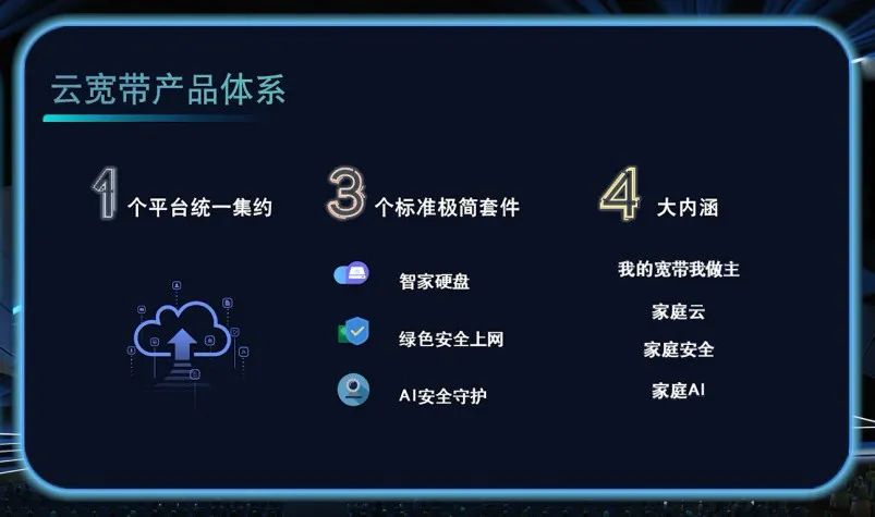 雲寬帶是一個完整的產品體系,基於雲寬帶平台統一集約,實現靈活定製;疊加三款標準套件,滿足“存儲、安全、智能”三位一體的生活場景中的基本需求;提出“家庭雲”、“家庭安全”、“家庭AI”、“我的寬帶我做主”四大內涵,推出“智家硬盤”、“天翼雲電腦”、“綠色安全上網”、“親情守護”、“AI安全守護”、“海外加速”、“遊戲加速”、“上行提速”、“直播寬帶”等系列增值產品,可以實現用户對生活場景中的一切超前夢想。