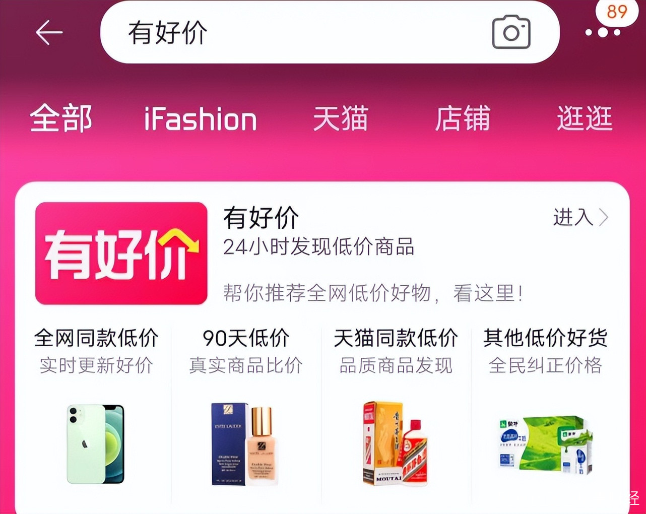 有意思的是,“有好價”頻道並沒有放在淘寶界面主頁比較顯眼的位置,在其它的熱門版塊區域也沒有設置入口,目前暫時只能在淘寶APP界面通過搜索欄,搜索“有好價”才能找到相應的頻道入口。