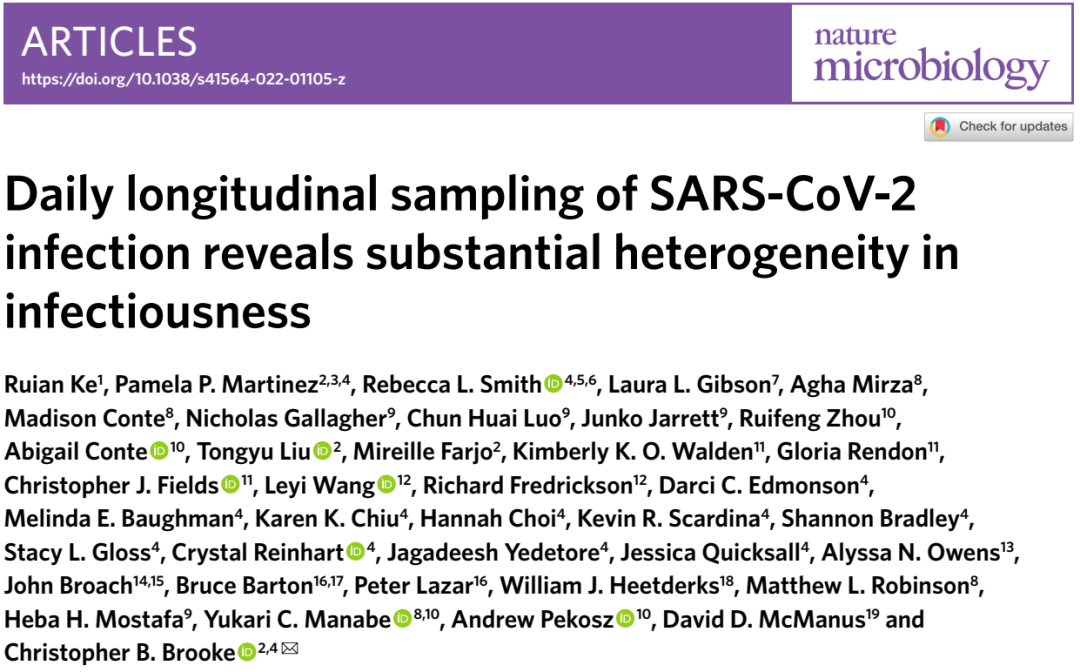 2020年秋天至2021年春天,伊利諾伊大學厄巴納-香檳分校(UIUC)對校內職工和學生進行了至少每週2次的SARS-CoV-2的PCR檢測,共納入了60例符合入選標準的受試者,即納入研究7天前SARS-CoV-2的PCR結果陰性且24小時內檢測結果陽性或5天內與陽性患者有密接接觸史。對受試者進行了連續14天的鼻拭子和唾液採樣,描述每個受試者的病毒動態變化過程。研究同時進行了抗原檢測和病毒分離培養。研究結果在Nature Microbiology上進行了發表。