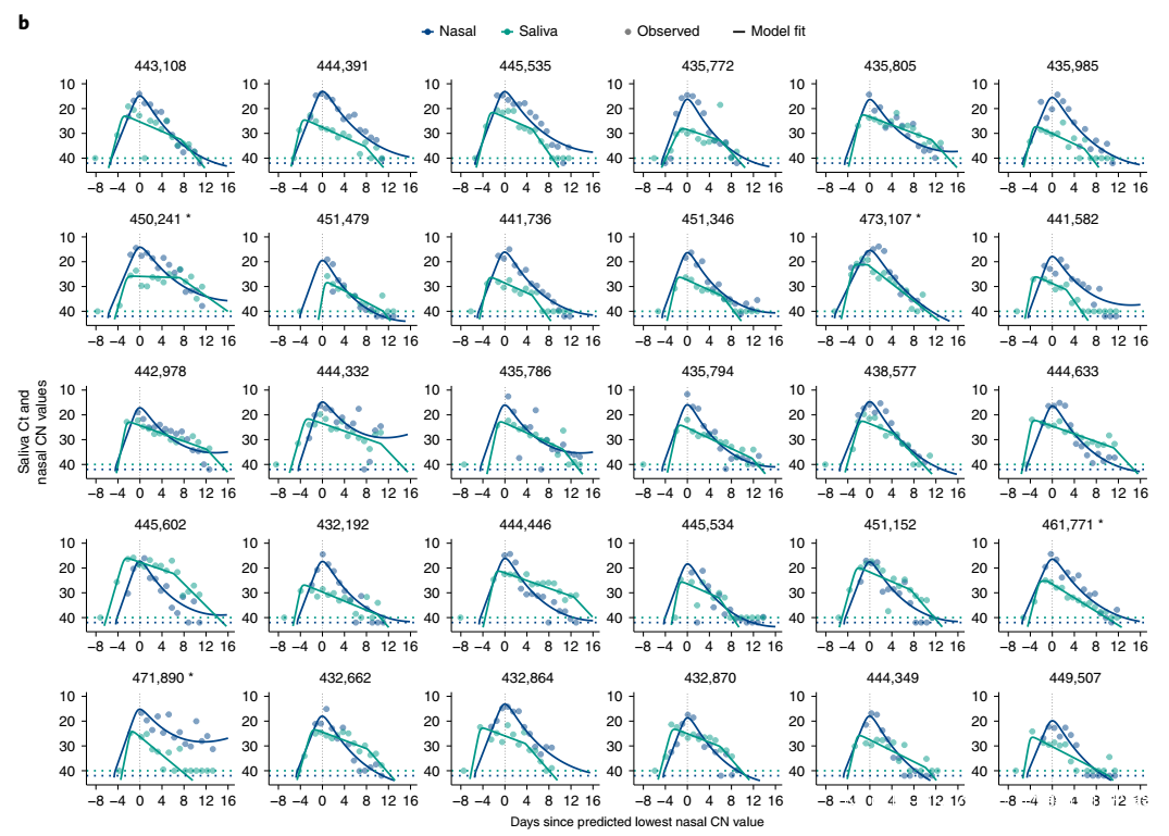 該研究通過建立不同的數學模型,更全面地闡述了不同個體間病毒的動態變化差異。鼻拭子和唾液標本中病毒動態變化不同。鼻拭子樣本中,病毒載量在達到峯值後快速下降,而後速度逐漸減慢。唾液標本中,病毒載量在達到峯值後的下降速度較鼻拭子標本有所減慢。研究計算了鼻拭子和唾液標本中,病毒載量從感染到峯值的平均時間分別為4.9天(±0.5天)和3.9天(±0.8天),病毒載量從峯值到檢測下限的平均時間分別為22.3天(±8.3天)和14.9天(±3.2天)。