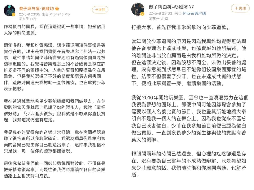 10號凌晨葉同學發完微博後,當天晚上,樂隊當事二人也各自發帖回應: