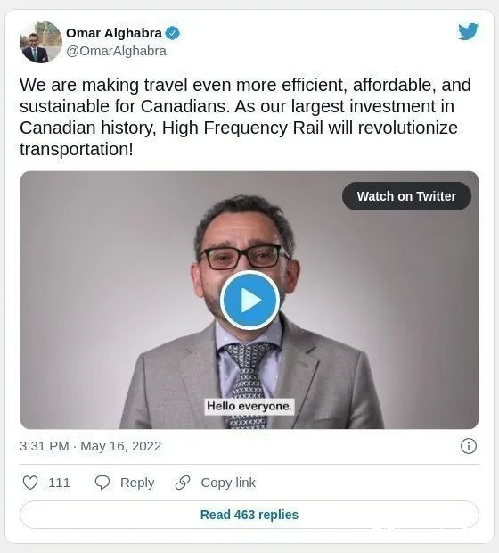 Omar Alghabra説:我們正在使加拿大人的旅行更加高效、負擔得起和可持續。作為我們在加拿大歷史上最大的投資,高鐵將徹底改變交通!