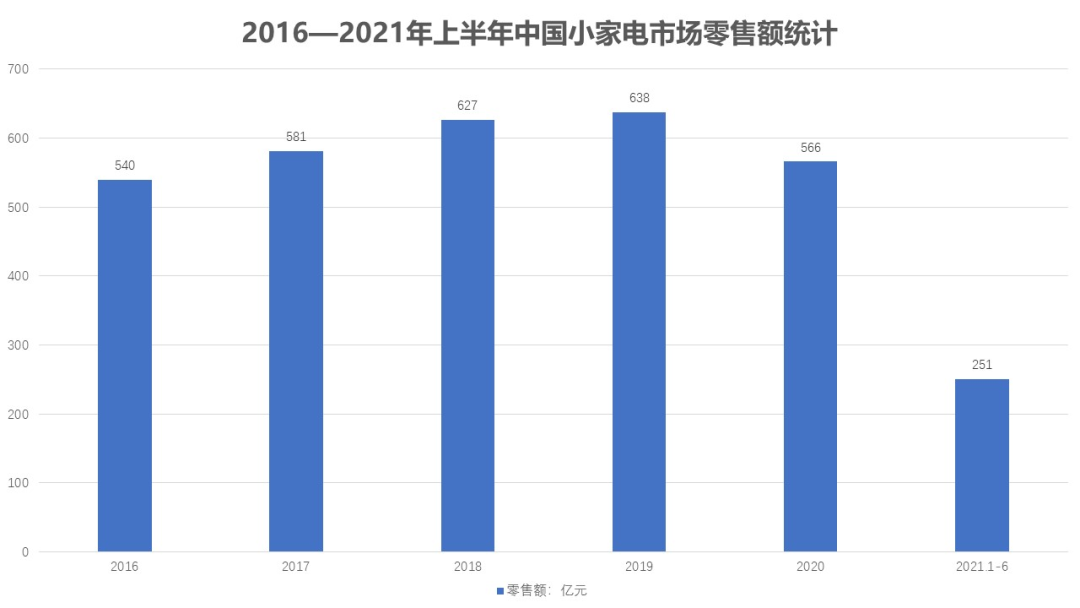 中商情報網的數據顯示,2021上半年小家電零售額共計250.8億元,同比下降8.6%,2020年全年這一數字為566億元,以此推測2021年全年國內小家電行業的市場規模約為500-550億元。