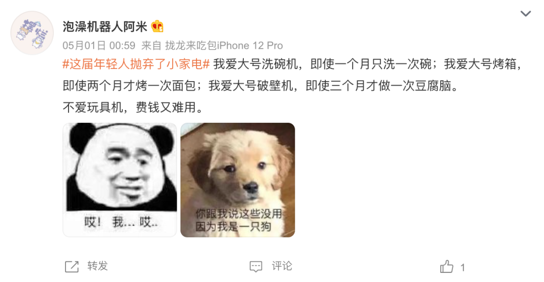 “別説年輕人了,我一個倆娃的家庭主婦也覺得所謂小家電沒啥大用處,太佔地方,利用率太低。當然,特別愛吃某一類食物,利用率高的還是可以考慮的,比如破壁機,可以解決早上豆漿,米糊等問題,可問題是人不可能一直都吃一樣的東西吧!”