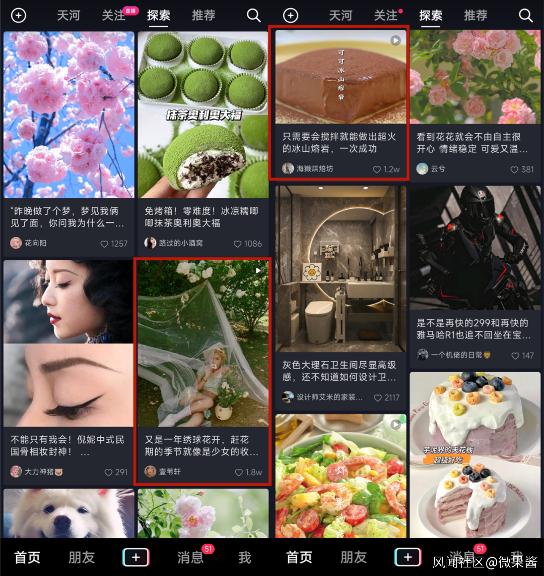 **在主頁面上,**兩個App都是雙瀑布流的排列方式,內容類型也相似,大多是種草,並以封面圖+文案+賬號名稱+點贊數的組合形式展示。
