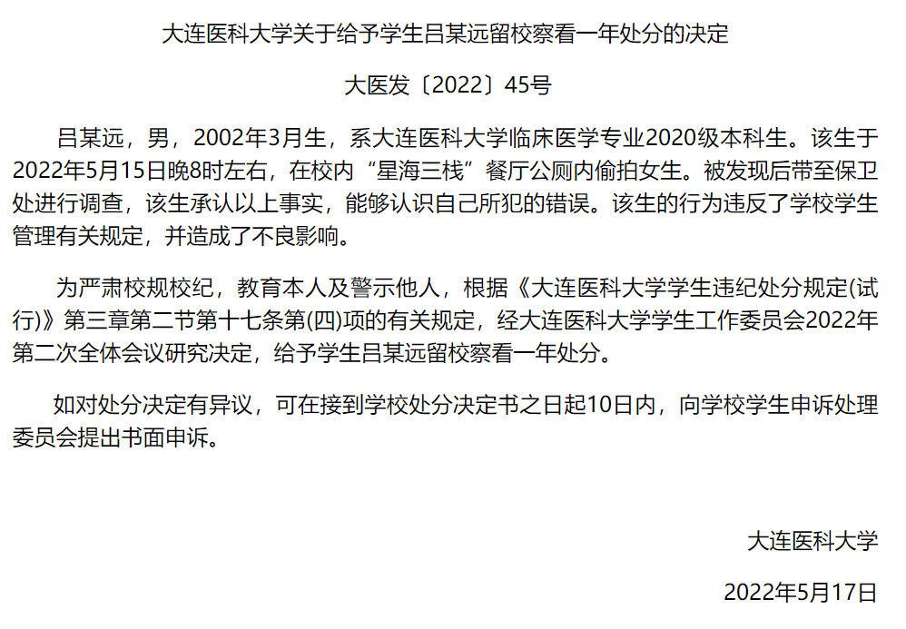 大連醫科大學臨牀醫學專業2020級本科生呂某遠,因在餐廳公廁內偷拍女生,被學校給予留校查看一年處分。