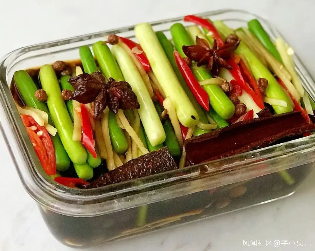 用完後以及用不完的蒜薹戳👇這個圖片,按照我之前的這個菜譜做成醃菜,超美又好吃: