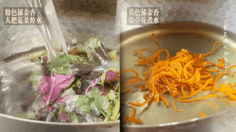 3、染色部分:粉紅色我用的莧菜;黃色用的蟲草花。