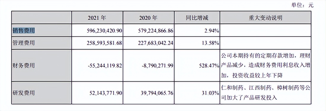 仁和藥業實現營收49.36億元,歸母淨利潤6.65億元。但銷售費用卻高達5.96億元,同比增長2.94%,銷售費用率為12%;而其研發費用卻僅為5214.38萬元,研發費用率僅為1.06%,研發費用還不到銷售費用的十分之一。