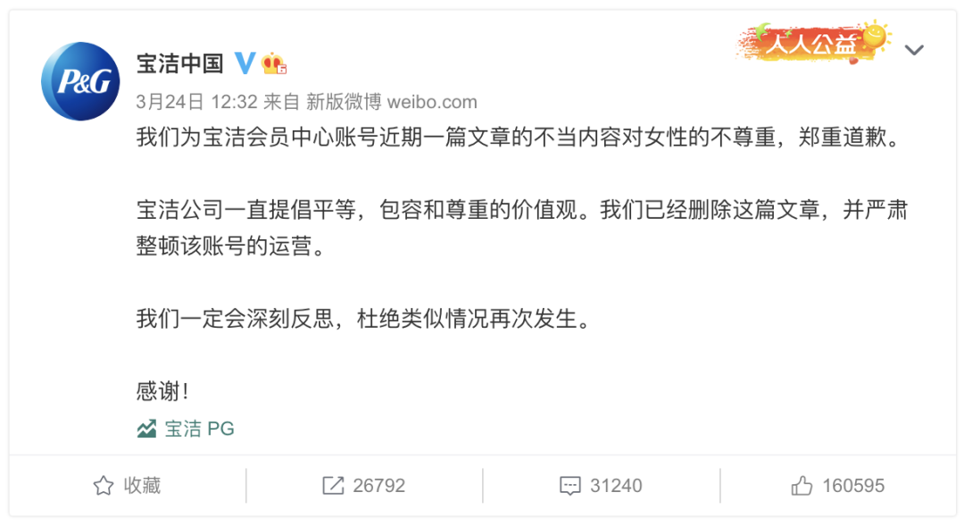 寶潔中國官微表示,為寶潔會員中心賬號近期一篇文章的不當內容對女性的不尊重,鄭重道歉。