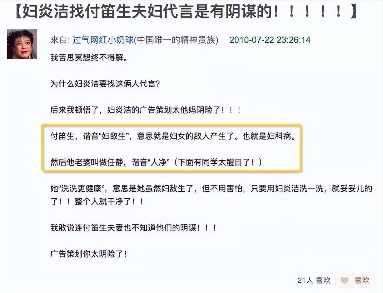 一條由付笛生夫婦拍攝的婦科洗液廣告,洗腦廣告“洗洗更健康”讓婦炎潔進入大眾視野的同時,也讓其在未來的一段時間成為國內洗液市場的一匹黑馬。