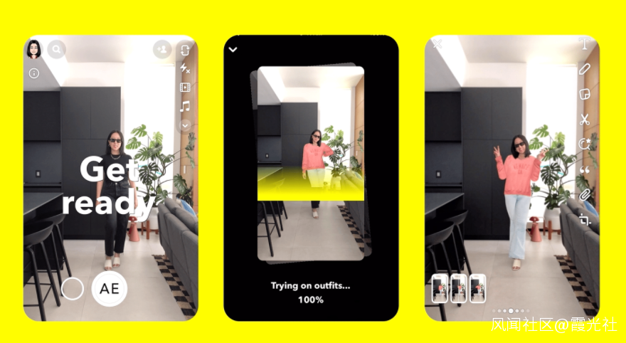 在Snapchat新推出的全新AR工具“Dress Up”上,用户可以挑選一件衣服並通過AR鏡頭試穿,也可以拍下來並與朋友分享。Dress Up如今會有創作者的內容,以及來自品牌的建議和想法,而這些內容都會根據用户的喜好、甚至所在的位置的變化而變化。