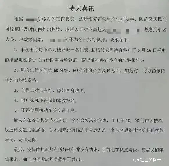 第二,每次出行時間為60分鐘,60分鐘內必須及時返回,如果超時,將取消該樓棟外出購物資格。