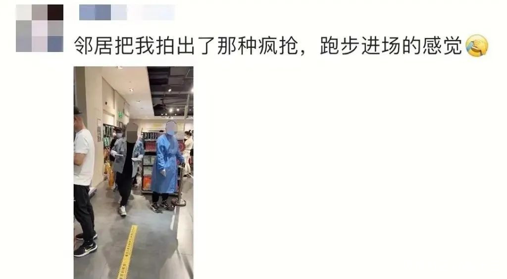 我一獲得了外出採購資格的朋友,衝到超市全程絲毫不敢鬆懈,嚴絲合縫,馬不停蹄,被鄰居拍下了他搶購完東西火急火燎一路風風火火的樣子,我看了之後感覺:沒有因為他們可以出門而感到愉快,反而有點更心疼上海人了……