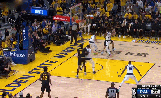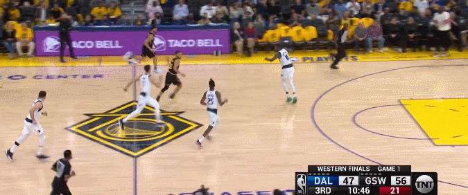 第二次東契奇繼續想找庫裏,但他知道勇士會保護,維金斯會和庫裏對他形成短暫夾擊再返位,東契奇抓住了這個空檔,想直接從左邊突破。