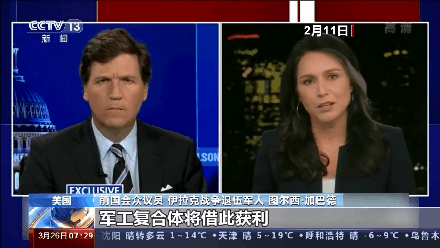 ▲2022年2月11日,美國前國會眾議員圖爾西・加巴德在接受福克斯新聞採訪時表示,軍工複合體將因戰爭賺得盆滿缽滿,但美國、烏克蘭、俄羅斯人民都將為此付出巨大的代價。