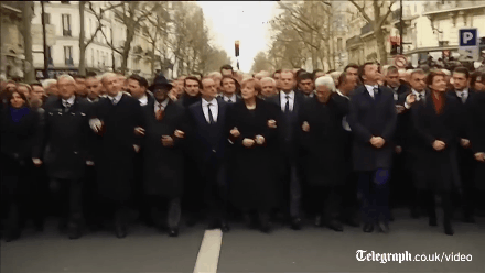 例如2015年1月,約40名各國政要手挽手上街,聲討《查理週刊》恐怖襲擊案。英、法、德三國領導人走在遊行隊伍的最前面,被《紐約時報》社論譽為“萬眾一心”。