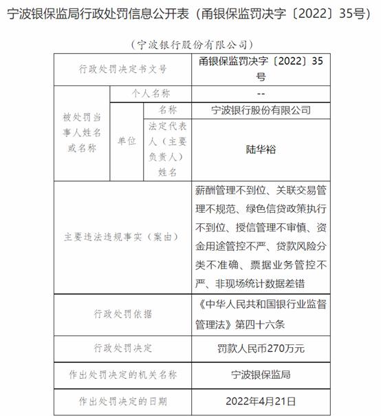 4月23日,銀保監會官網信息顯示,寧波銀行因薪酬管理不到位、關聯交易管理不規範、綠色信貸政策執行不到位、授信管理不審慎、資金用途管控不嚴、貸款風險分類不準確、票據業務管控不嚴、非現場統計數據差錯等,被罰款270萬元。