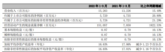 這也體現在業績層面。今年一季度,寧波銀行實現營業收入152.63億元,同比增長15.40%;歸屬於上市公司股東的淨利潤57.20億元,同比增長20.80%。不良貸款率穩定在0.77%。