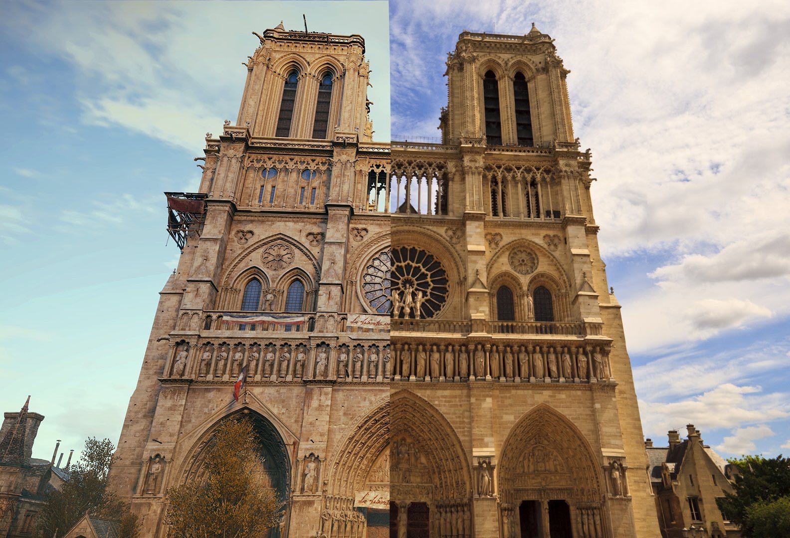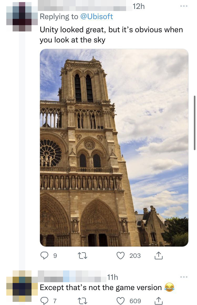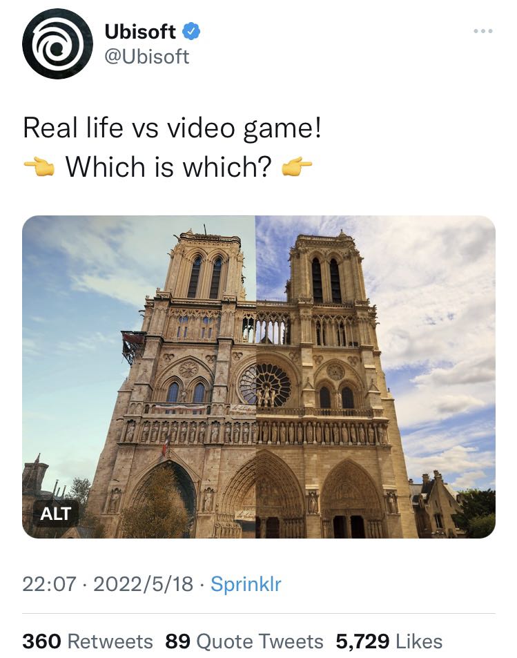 “右邊的圖片是現實生活,儘管畫面上看不出多少細節。但左邊的圖片確實取自遊戲刺客信條。”