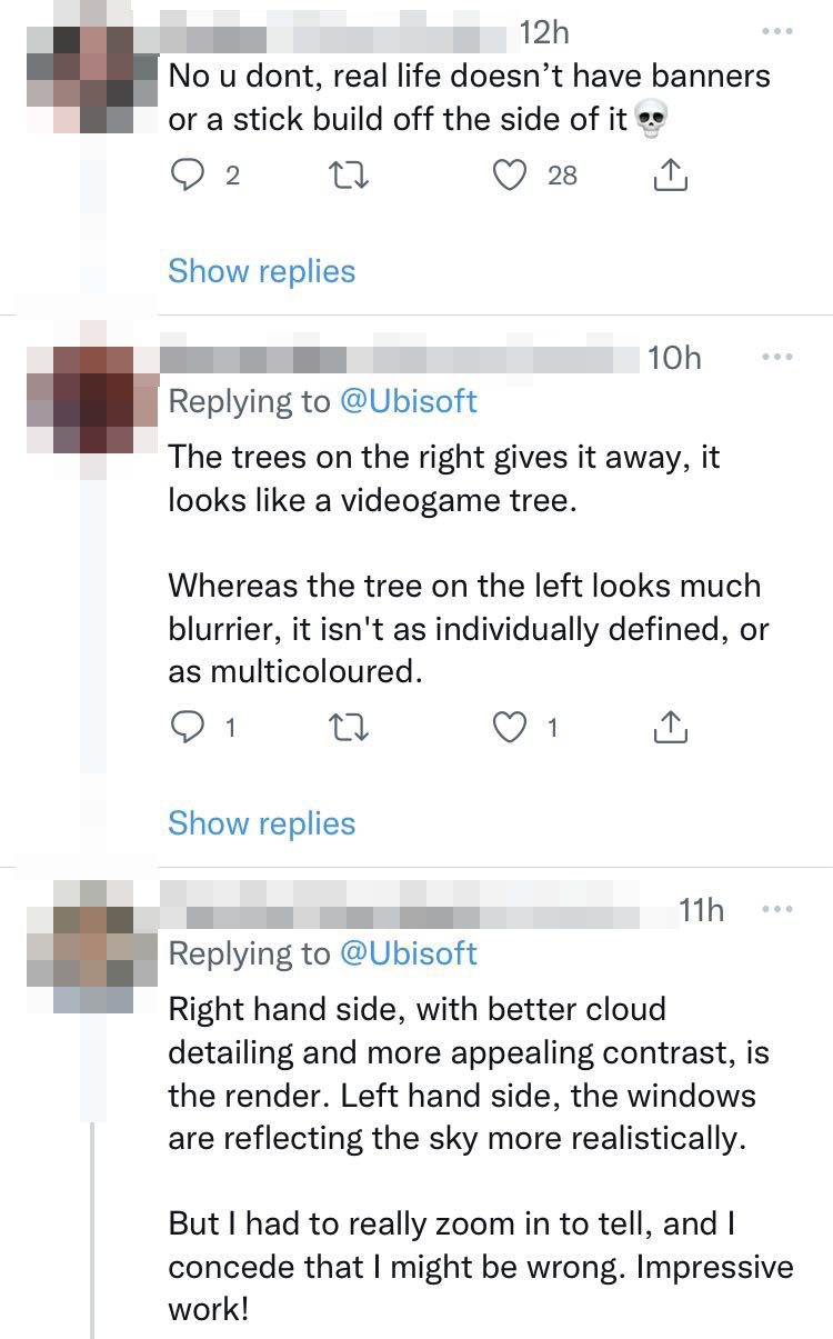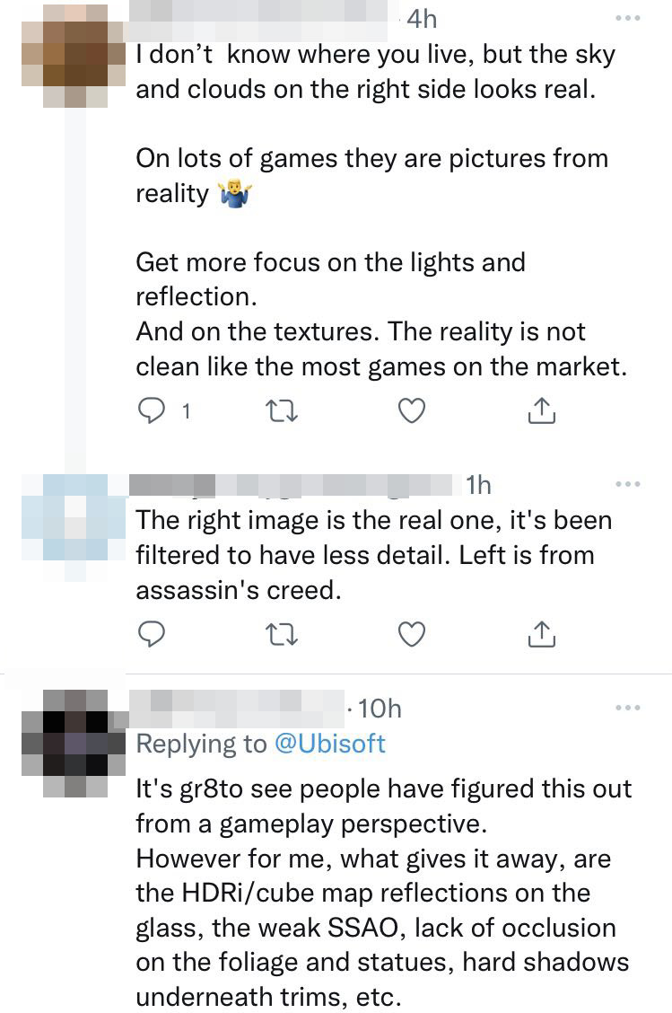 “很高興看到大家從遊戲的角度討論哪張是現實生活,然而對我來説,左右兩張圖片透露給我的信息是透過玻璃反射出的高動態範圍圖像/立方體貼圖,較弱的屏幕空間環境光遮蔽,植物和雕塑缺少遮擋,裝飾下的陰影很僵硬等等。”