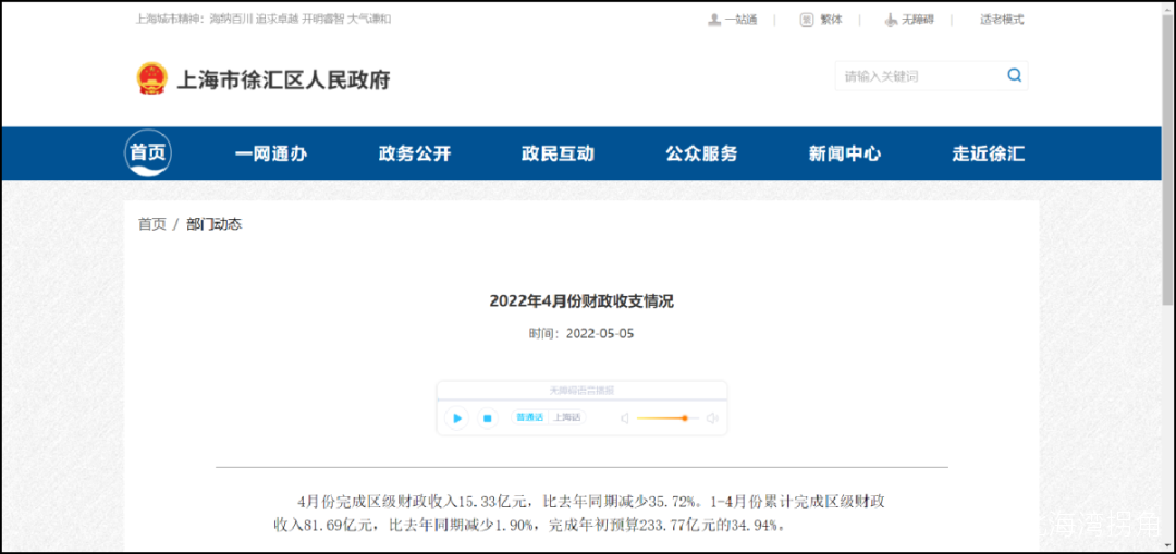 數據顯示4月徐匯財政收入15.33億元,同比減少35.72%
