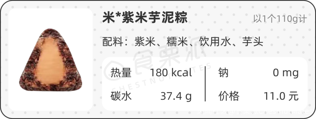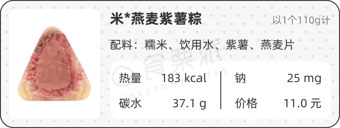 這款粽子——都不知道該不該叫它粽子了,更像是飯糰版歐包,皮薄餡大:大塊的紫薯餡,還能看到纖維,沒有搗成很爛的紫薯泥;糯米只有薄薄一層,吃起來口感很硬。沒有留意到有燕麥,大概加得不多吧。
