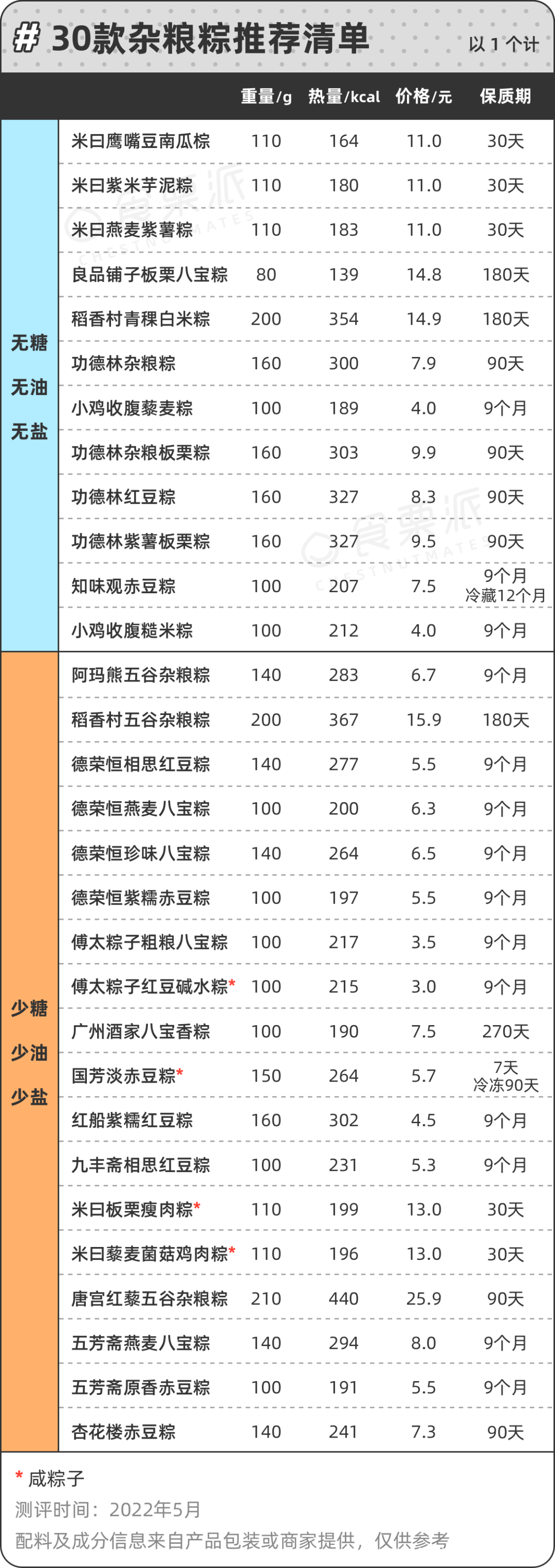 養生girl/boy一定不能錯過——無糖無油無鹽的雜糧粽。本次測評一共蒐集了27個品牌的66款雜糧粽,其中有12款粽子的配料表十分乾淨:不加油、不加糖、不加鹽。追求健康的寶子,pick這12款絕對沒錯啦。